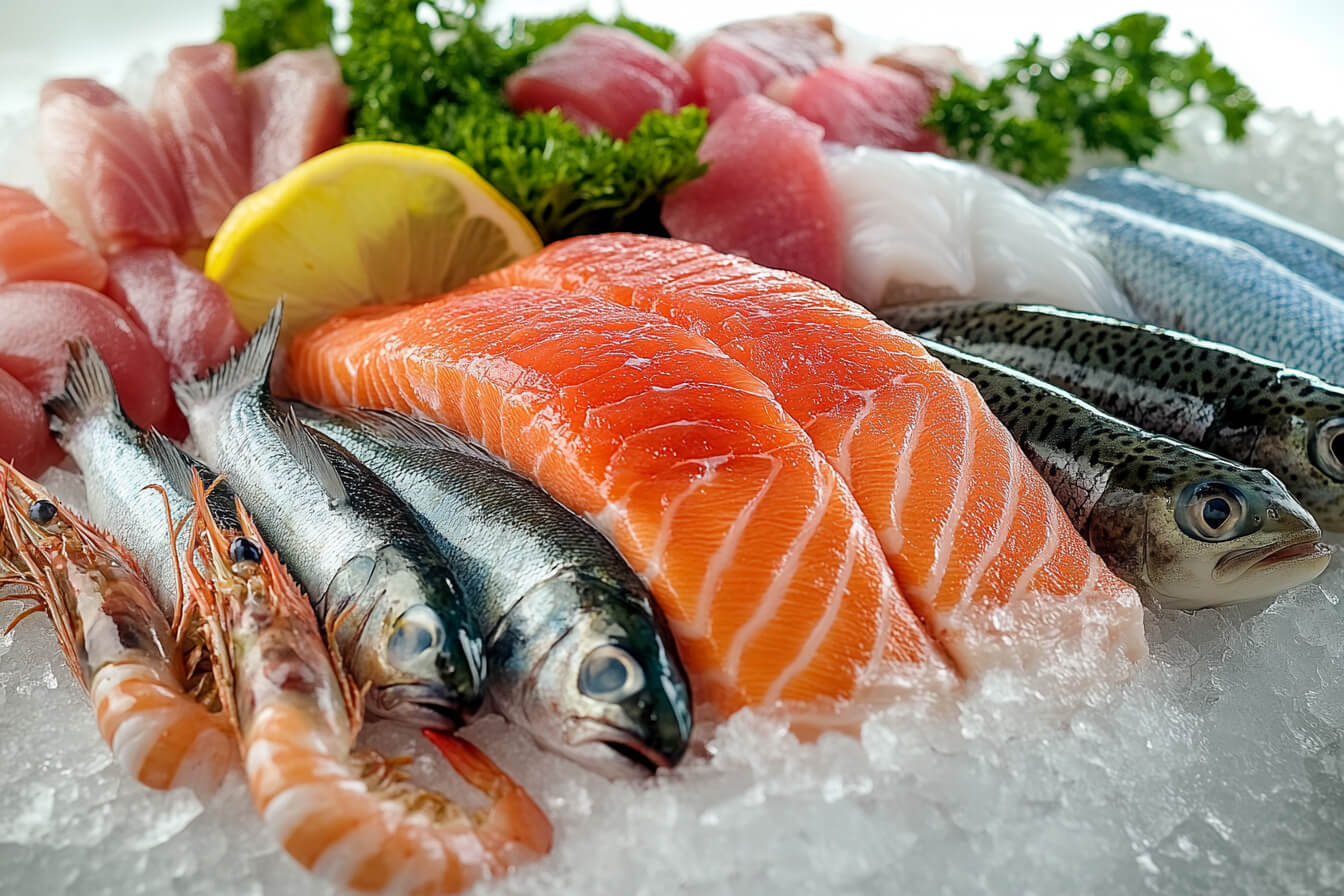 Whole saltwater/freshwater fish, fish fillets/loins, peeled/shell-on shrimp, shelled shellfish meat, squid rings/tubes, sea cucumbers, abalone, and other high-end seafood products.