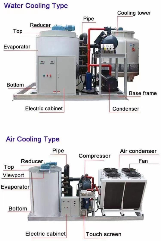 通過補水閥,水自動進入儲水箱,然後水通過流量控制閥被泵送到分流頭,水均勻地噴灑在製冰機表面,並像水幕一樣流過製冰機。水冷卻到冰點,未蒸發結冰的水會通過多孔水箱流入儲水箱,重新開始循環。