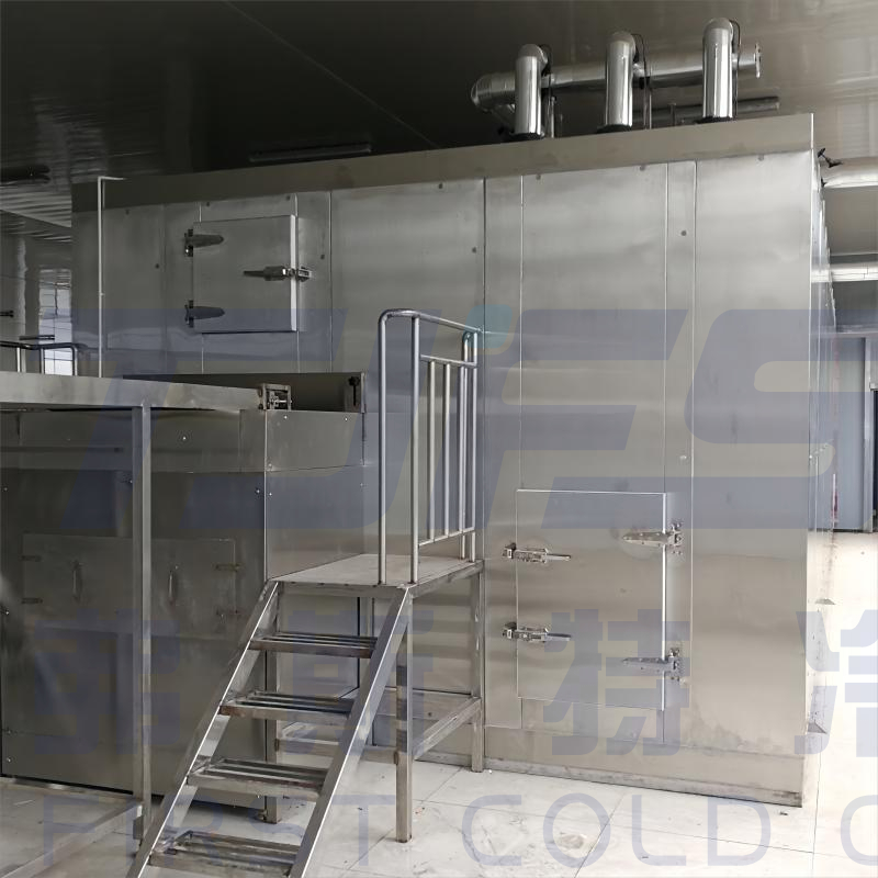 1、根據冷凍產品的特點設計工藝結構參數,設計有效表面積大的蒸發器;採用大間距鋁合金翅片管組和變葉片間距設計,減少蒸發器與倉間溫差,設計選型按蒸發溫度-45攝氏度計算。蒸發麵積充足,傳熱效率高,充分考慮進出溫度的影響,設計延遲結霜,延長速凍機工作時間。