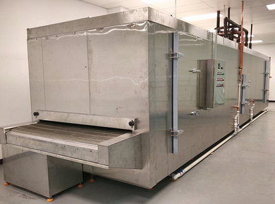 隧道式速凍機主要由傳動部分、蒸發器、PU及電器設備組成。網帶採用大棒鏈條傳動,減少機械摩擦,運行採用矩形方管+超高耐磨。冷凍機內部結構採用不銹鋼,水除霜系列裝置,傳動軸一般為不銹鋼軸,乾淨衛生,設備可靠,使用壽命長,皮帶可上下通風,冷凍速度快。蒸發器:蒸發器採用不銹鋼或銅或鋁管及鋁翅片,採用變片間距,力求風循環順暢。傳熱效率高,速凍(製冷)快,蒸發器沿皮帶方向運行,受風面積大,因此不易結霜,可長時間連續生產。